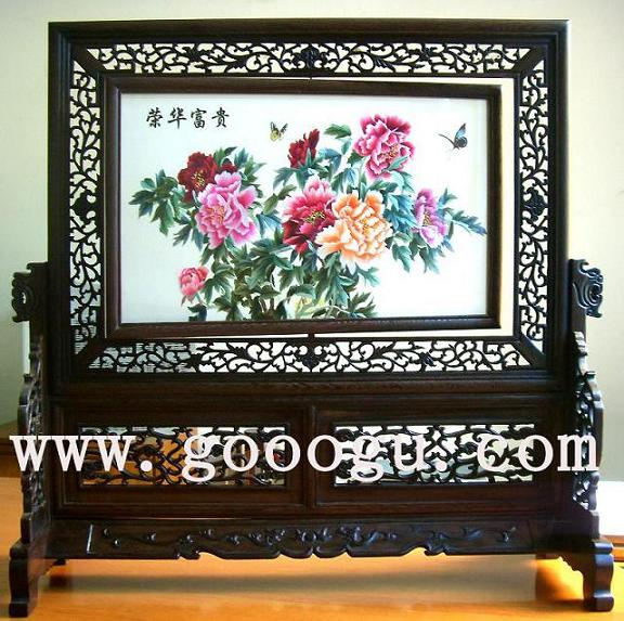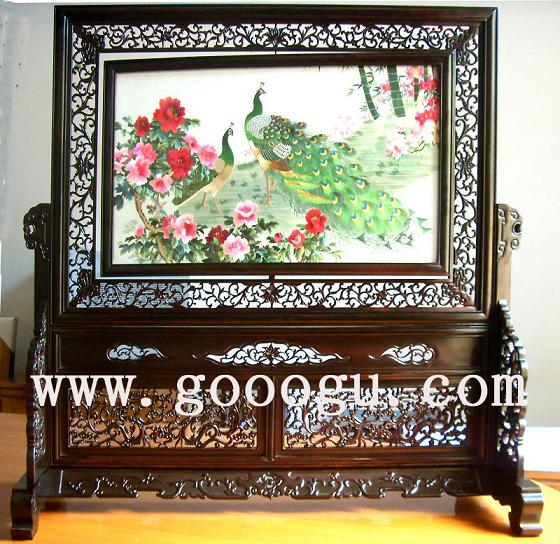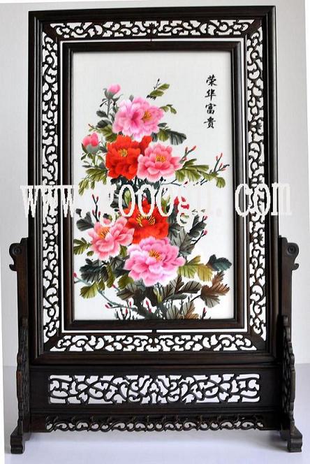 凤穿牡丹双面绣台屏|檀木雕花架刺绣屏风|刺绣工艺品