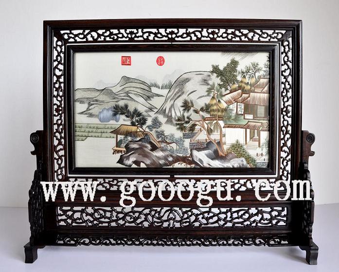风景双面台屏唐寅山水双面绣外资企业采购团购特色好绣品