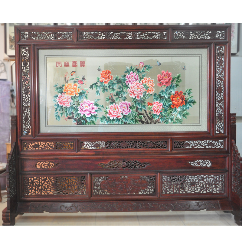 球友会官方入口屏风 手工刺绣 大型四扇折叠屏风 牡丹花 红木工艺品