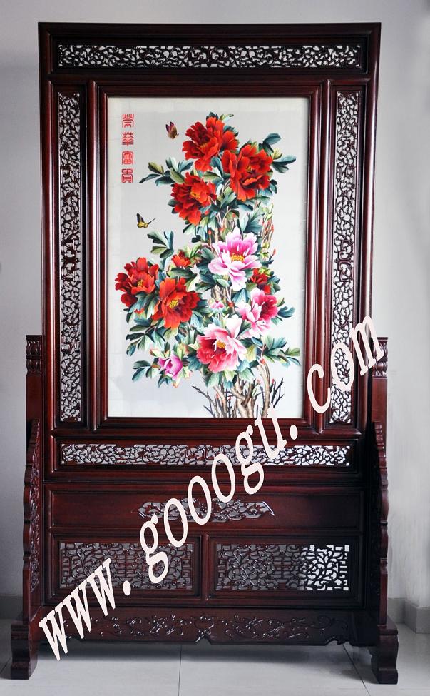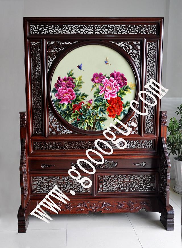 球友会官方入口牡丹玄关 家用屏风 纯手工刺绣 紫檀木工艺品