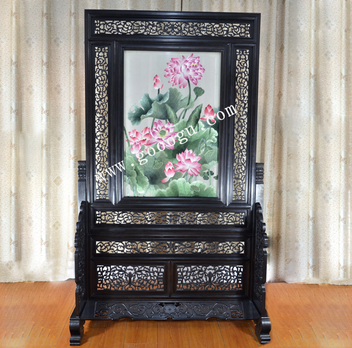 球友会官方入口玄关屏风 精品荷花 手工刺绣 紫檀架