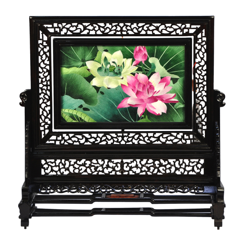 产品名称:紫檀苏州双面绣 (作品代码:SZ-7889) 产品规格:46X41CM(外框尺寸) 25X16CM(绣品尺寸) 产品工艺:苏州绣娘手工刺绣。绣品图案部分可360度旋转 产品材质:真丝面料+桑蚕丝线+玻璃+紫光檀木架 产品包装:锦盒礼品装 娇古出厂价:2800元/件 市场零售参考价:6000元左右 最小起订量:1件----厂家直销,可当天发货(可混配图案) 产品描述:紫光檀苏州双面绣为苏州绣娘手工刺绣而成,木框为目前中国苏州双面绣材质紫光檀,整体框架花纹雕刻细腻。图案有花卉(牡丹,梅花,荷花,兰花等),花鸟,动物(熊猫,老虎,鱼等),山水,风景,名家字画等。图案多达一百多种,有古色古香的,有现代气息的,高贵典雅,是赠送客人的特色礼品之一。 系列推荐