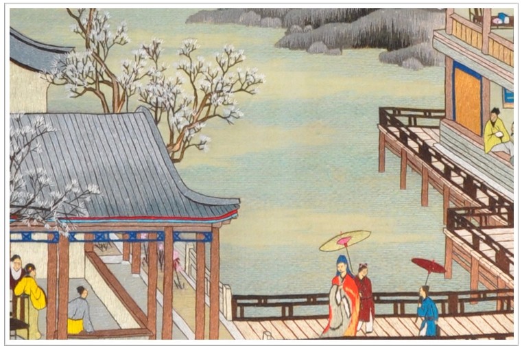 【产品工艺】:手工刺绣 【丝线材质】:蚕丝线 【用 途】:外宾礼品、生日礼物、贺寿礼品、领导升迁、商务礼品等等。 【出厂价】:1580元 【作品简介】:出处《史记封禅书》:自威(齐威王)、宣(齐宣王)、燕昭使人入海求蓬莱、方丈、瀛洲。此三神山者,其傅在勃海中盖尝有至者,诸仙人及不死之药皆在焉。其物禽兽尽白,而黄金银为宫阙。未至,望之如云;及到,三神山反居水下。临之,风辄引去, 忽闻海上有仙山,山在虚无缥缈间。楼阁玲珑五云起,其中绰约多仙子。 细节一 .jpg)