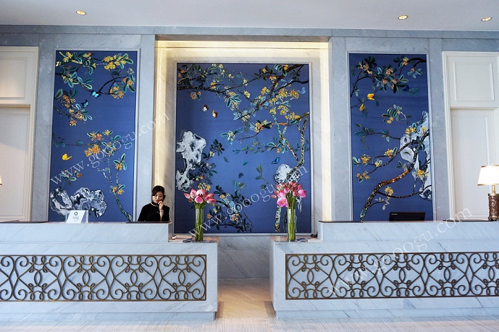 娇古球友会官方入口负责承接绿城集团杭州尊蓝钱江豪华精选酒店大堂的背景工程,该项工程由近30位绣娘耗时数月完成,刺绣效果层次鲜明、颜色过渡均匀自然,得到绿城集团领导的一致好评。“在最短的时间内做出最好的效果,为我们开业赢得了宝贵的时间”,是绿城集团领导对娇古球友会官方入口的评价。