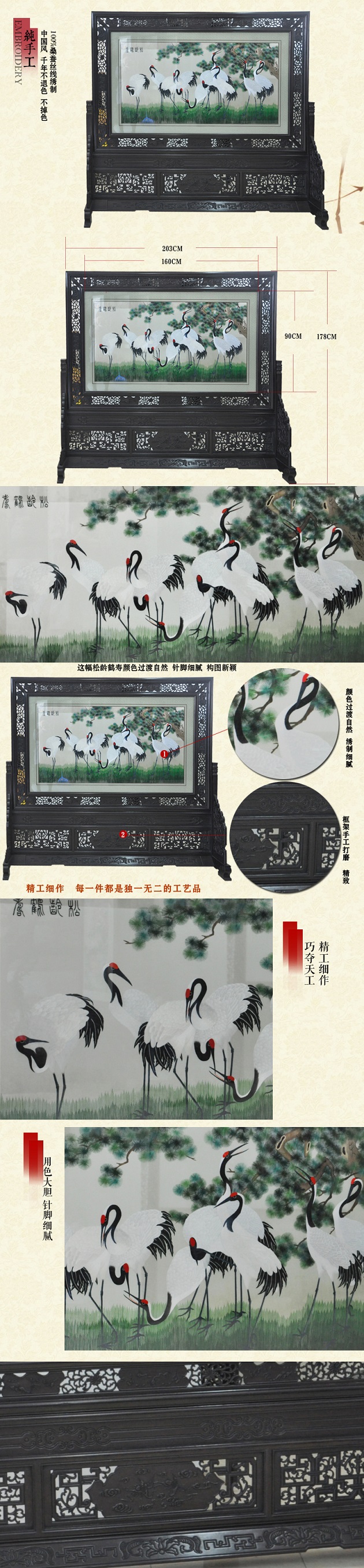 【产品名称】:松鹤延年(双面绣) (作品代码:p-1526) 【产品规格】:图案尺寸宽度160cm,高度90cm 外框整体尺寸宽203cm,高178cm 【产品工艺】:手工刺绣 【产品材质】:真丝面料+鸡翅木+桑蚕丝线+玻璃 【产品包装】:木箱包装,用海绵包扎,确保运输安全 【出厂价】:24800元 【产品运输】:我司负责发往客户指定地点,苏州附近城市可送货上门! 【产品说明】:松鹤延年双面绣屏风,是由苏州工艺师耗时数个月精心手工刺绣而成,刺绣图案以代表健康长寿的松鹤为题材绣工精细,简约 大方,颜色搭配均匀过渡自然,屏风的框架选用进口的鸡翅木为料,是球友会官方入口屏风中的经典作品。是居家和办公的重要装饰品之一!欢迎亲临娇古球友会官方入口展示厅观看实物! .jpg)