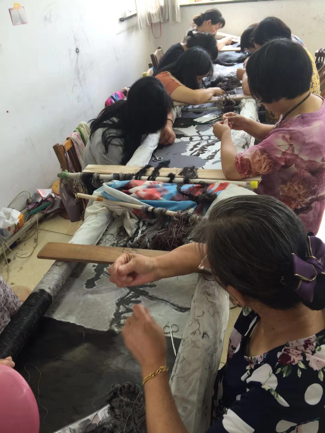 专业师傅现场装裱 这次的背景墙是用于董事长会见要客的VIP接待室,球友会官方入口刺绣尺寸长4.1米,高2.35米,在多位绣娘的紧张合作下,耗时3个多月完成。