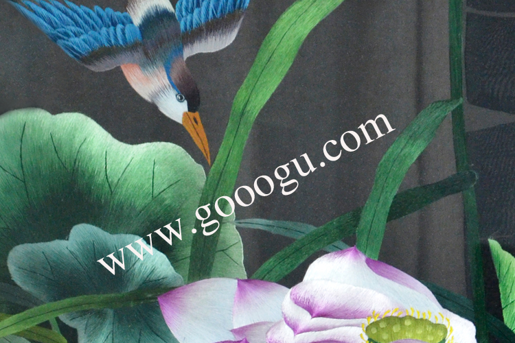 荷花细节特写、绣工精致、颜色的过渡渐变自然